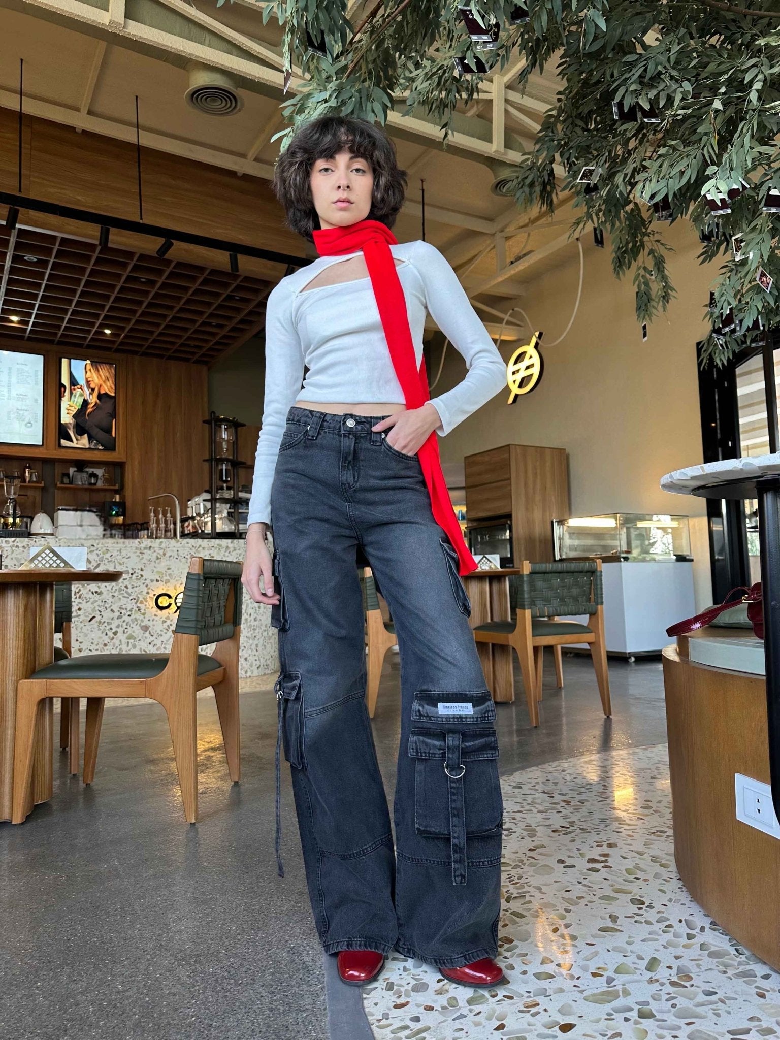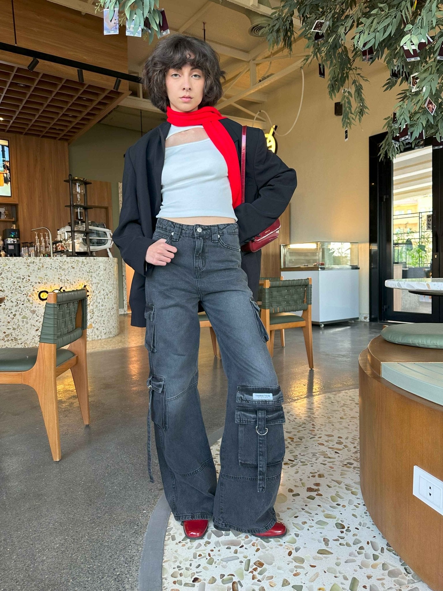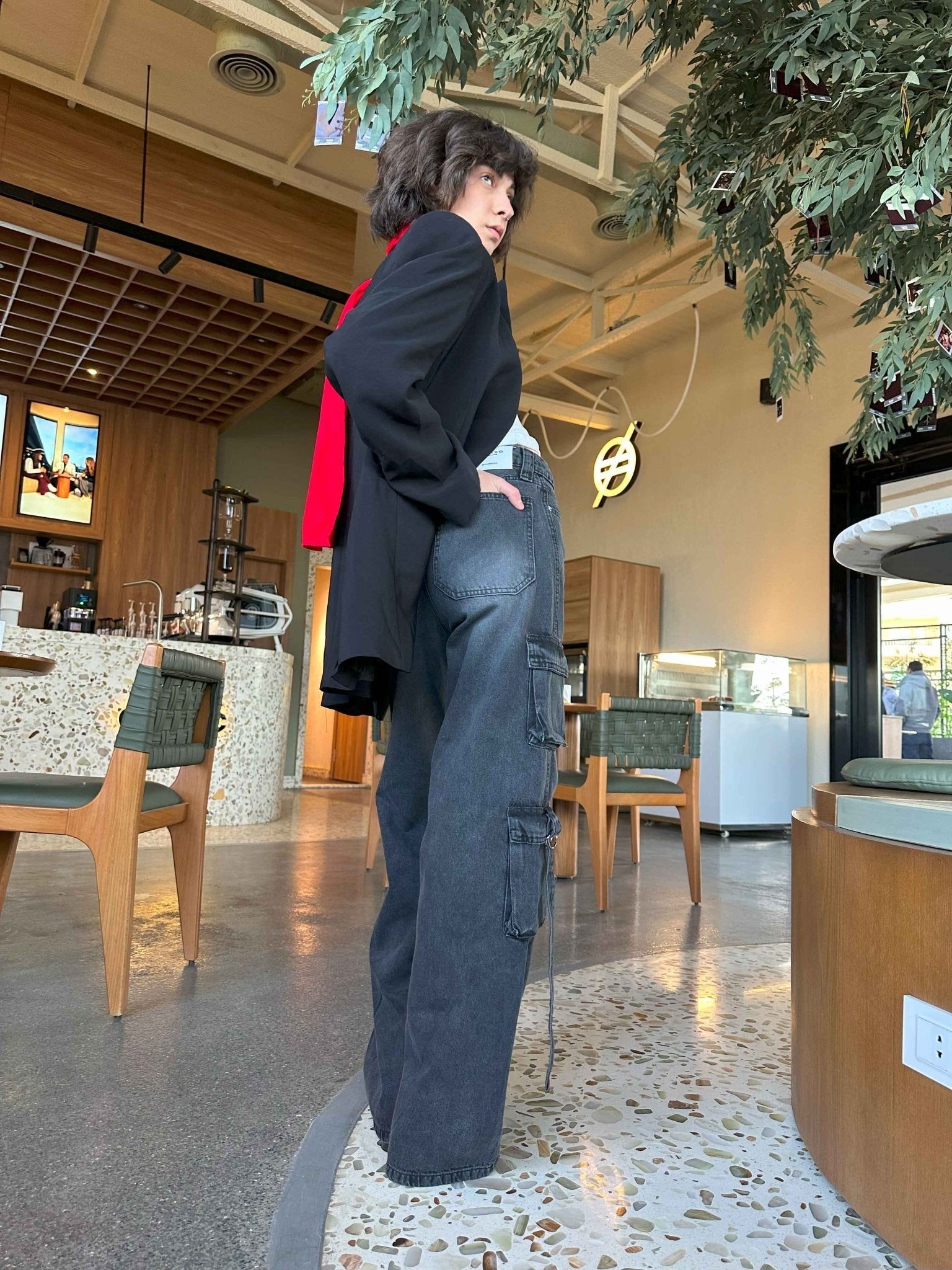 Elevate your casual look with these trendy wide-leg cargo jeans in a versatile acid grey shade. Designed with oversized pockets and adjustable drawstring hems, these jeans offer both style and functionality. Perfect for a relaxed, streetwear-inspired outfit, the mid-rise fit ensures comfort while the neutral color makes it easy to pair with any top. Whether you're running errands or going out, these cargo jeans provide the perfect blend of edgy and laid-back vibes. Color: Dark Acid Grey Fit: High-waisted for a classic look, cargo wide leg design for maximum comfort and style Oversized pockets and adjustable drawstring hem Durable and soft denim fabric Five-pocket styling for functionality Button and zip fly closure Material: Premium denim for long-lasting comfort 100% Cotton & Not Stretchy Care Instructions: Machine wash cold, tumble dry low Perfect for a laid-back day or to make a statement in any casual setting. Model is wearing size: 36 EUR, Height: 164 cm