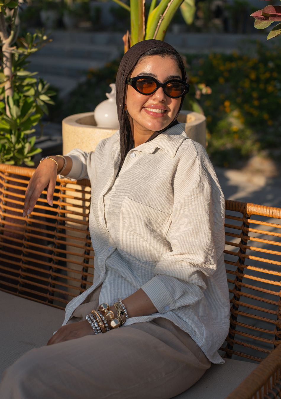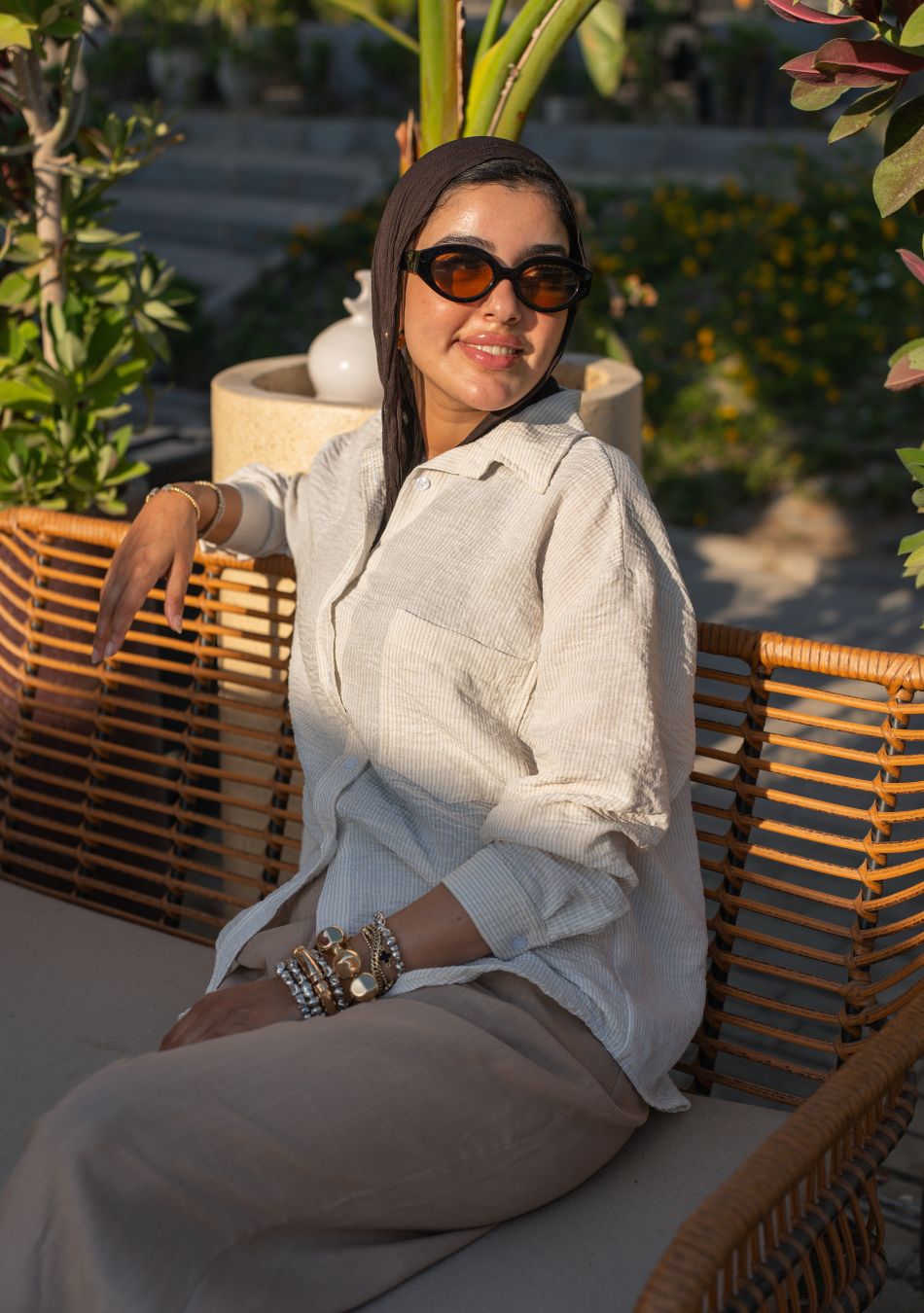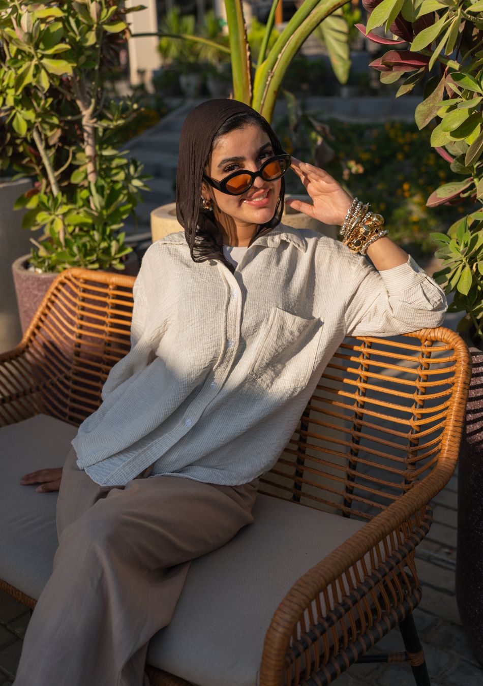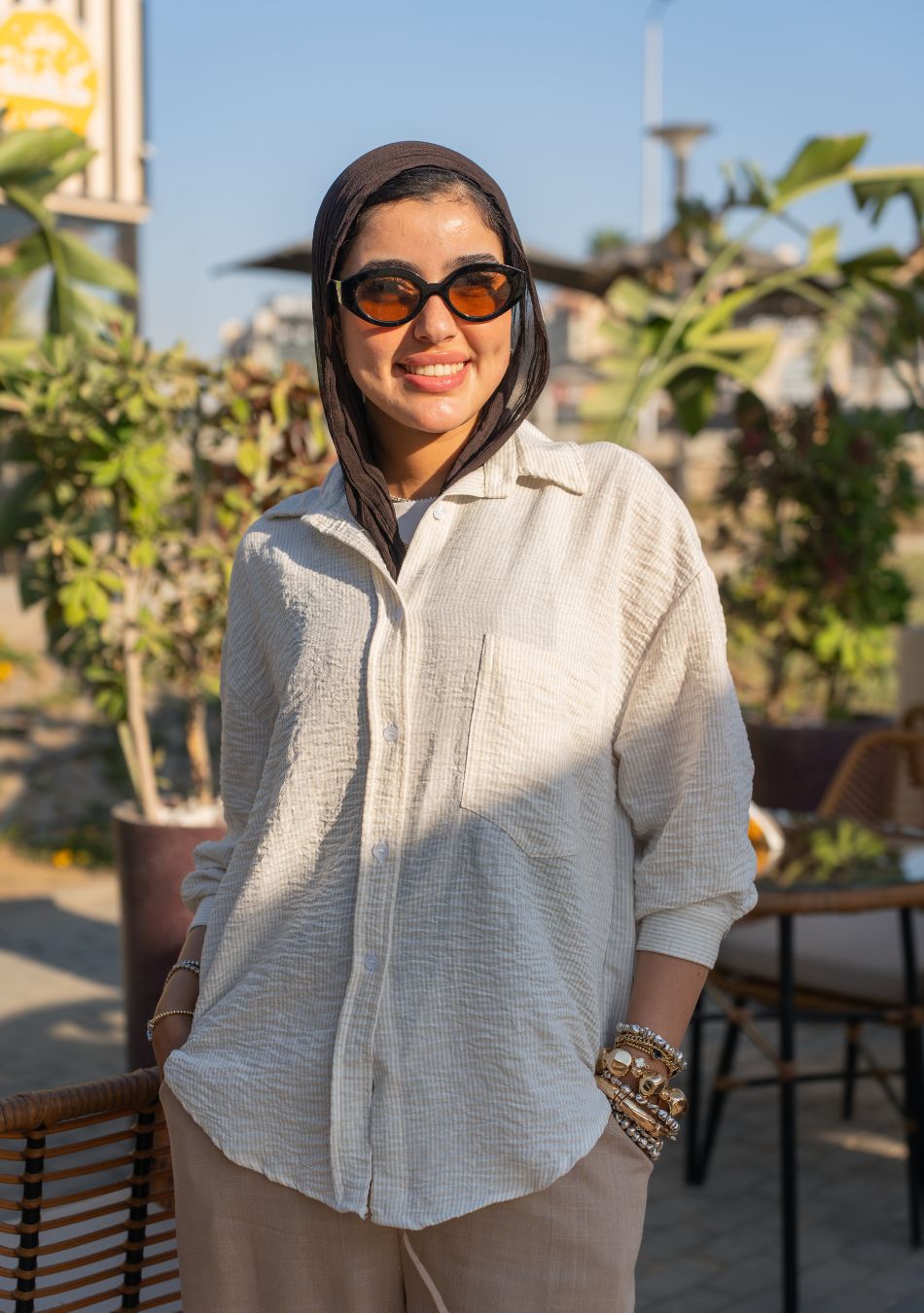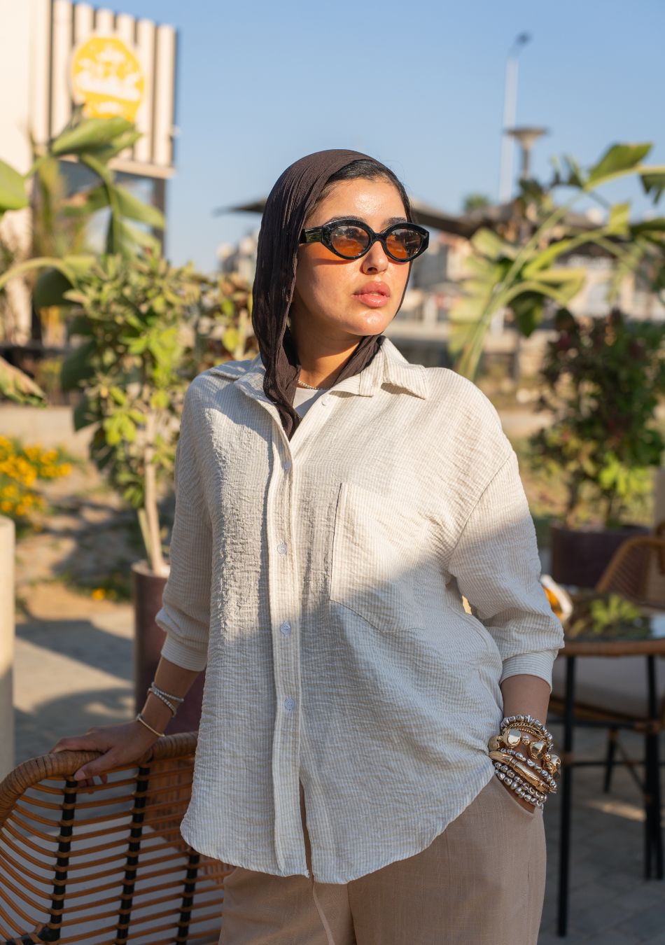 A lightweight, versatile button-down shirt perfect for layering or wearing on its own. Made from breathable fabric with a subtle textured finish, The Light Stripped Shirt is available in a range of soft, neutral shades—pink, beige, brown, café, baby blue, and black. Designed for comfort and style, it comes in sizes M to XXL.