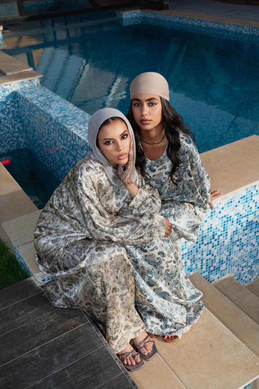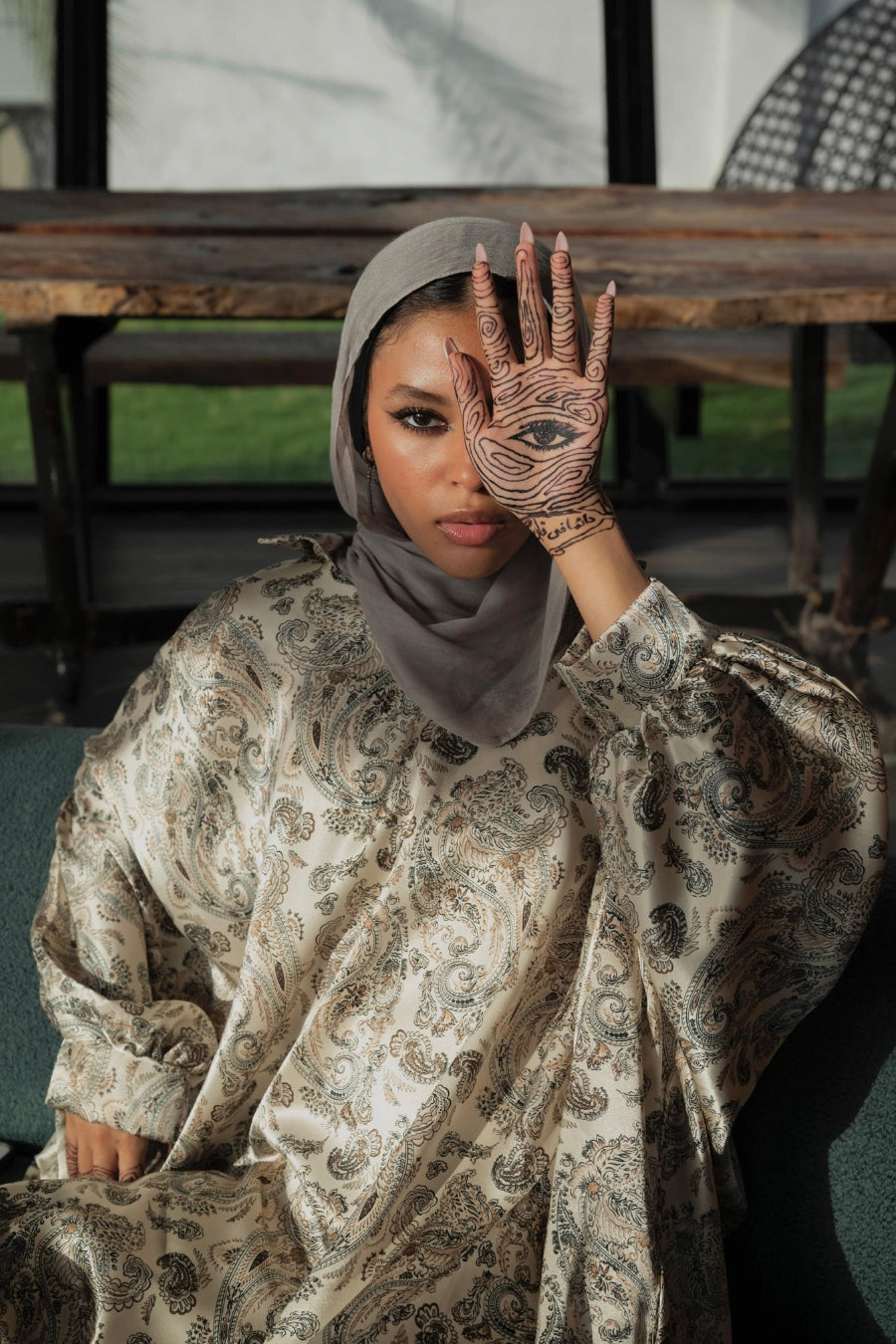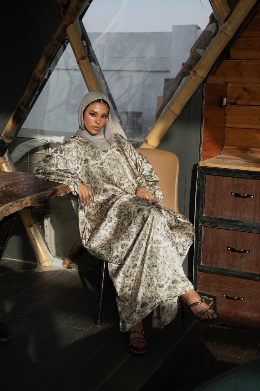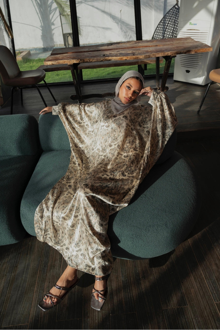 A flowy maxi dress designed with an elegant paisley print and soft lightweight fabric for effortless comfort. Perfect for chic outings or relaxed summer evenings. The wide sleeves and loose fit give it a graceful, airy silhouette.
