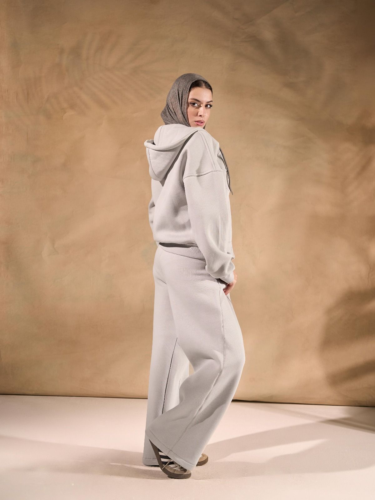 The hoodie features a relaxed fit, full zip closure, and practical pockets, while the matching wide-leg pants deliver comfort and flow with every step.