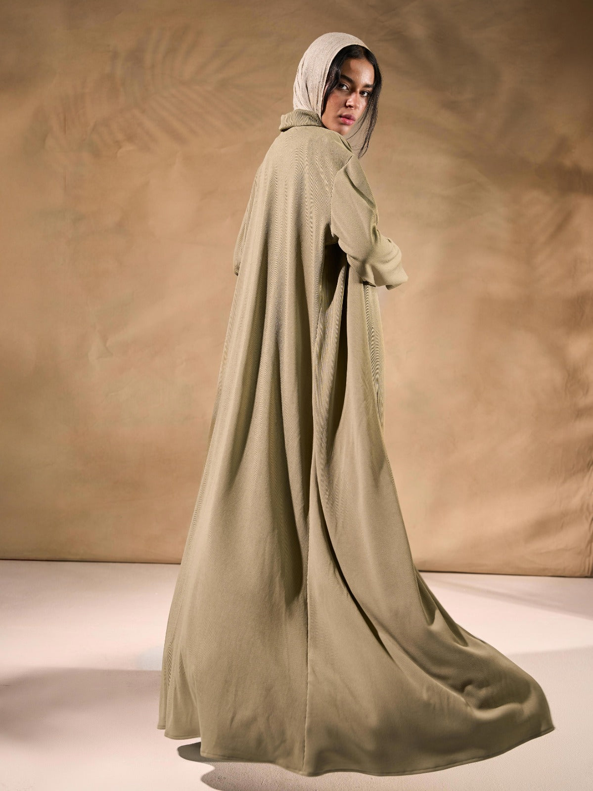 The cape-style top features wide sleeves and a relaxed open-front design, while the matching pants add harmony and grace to the full outfit.