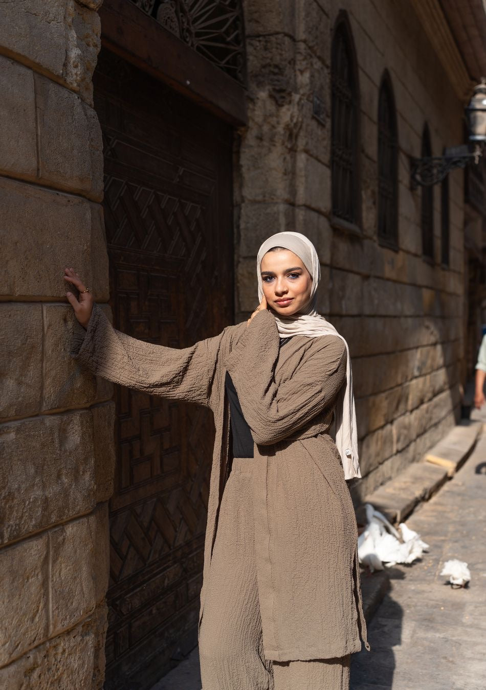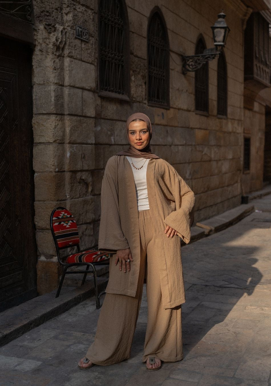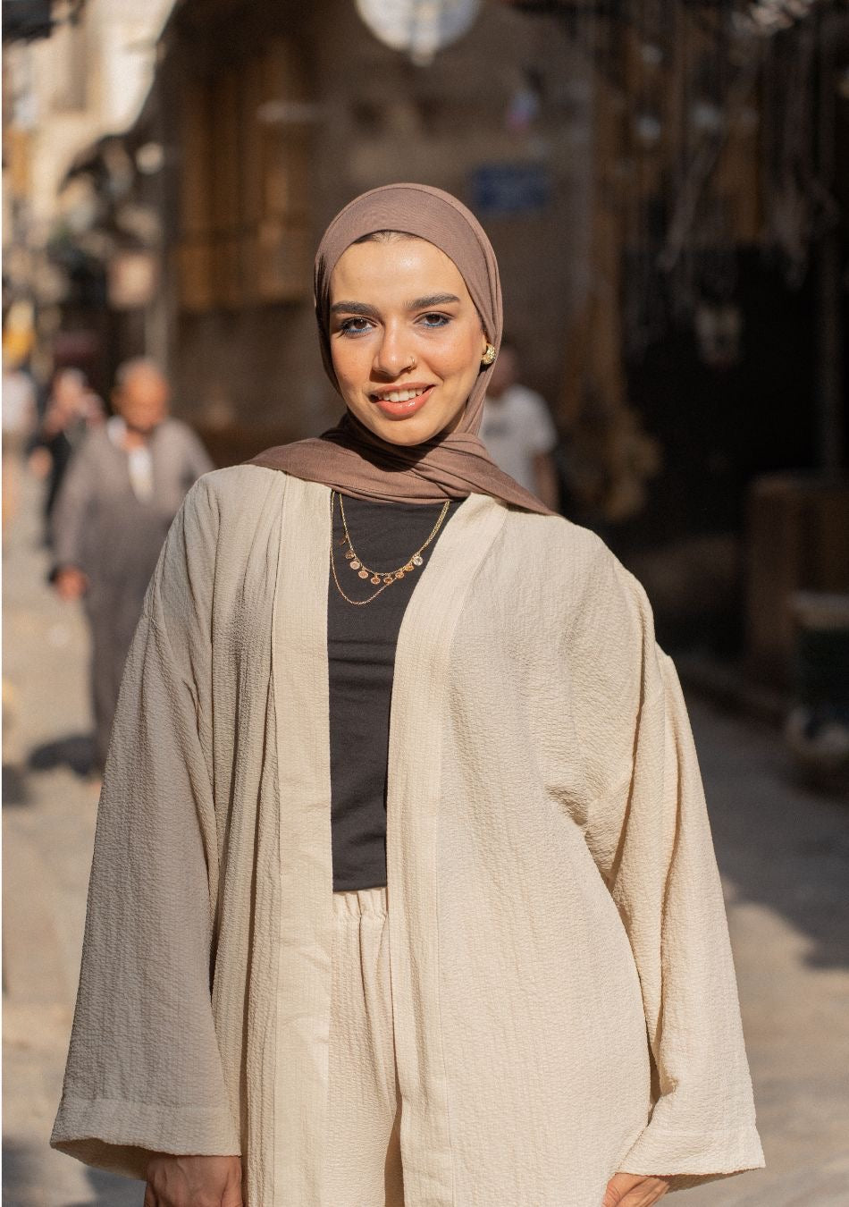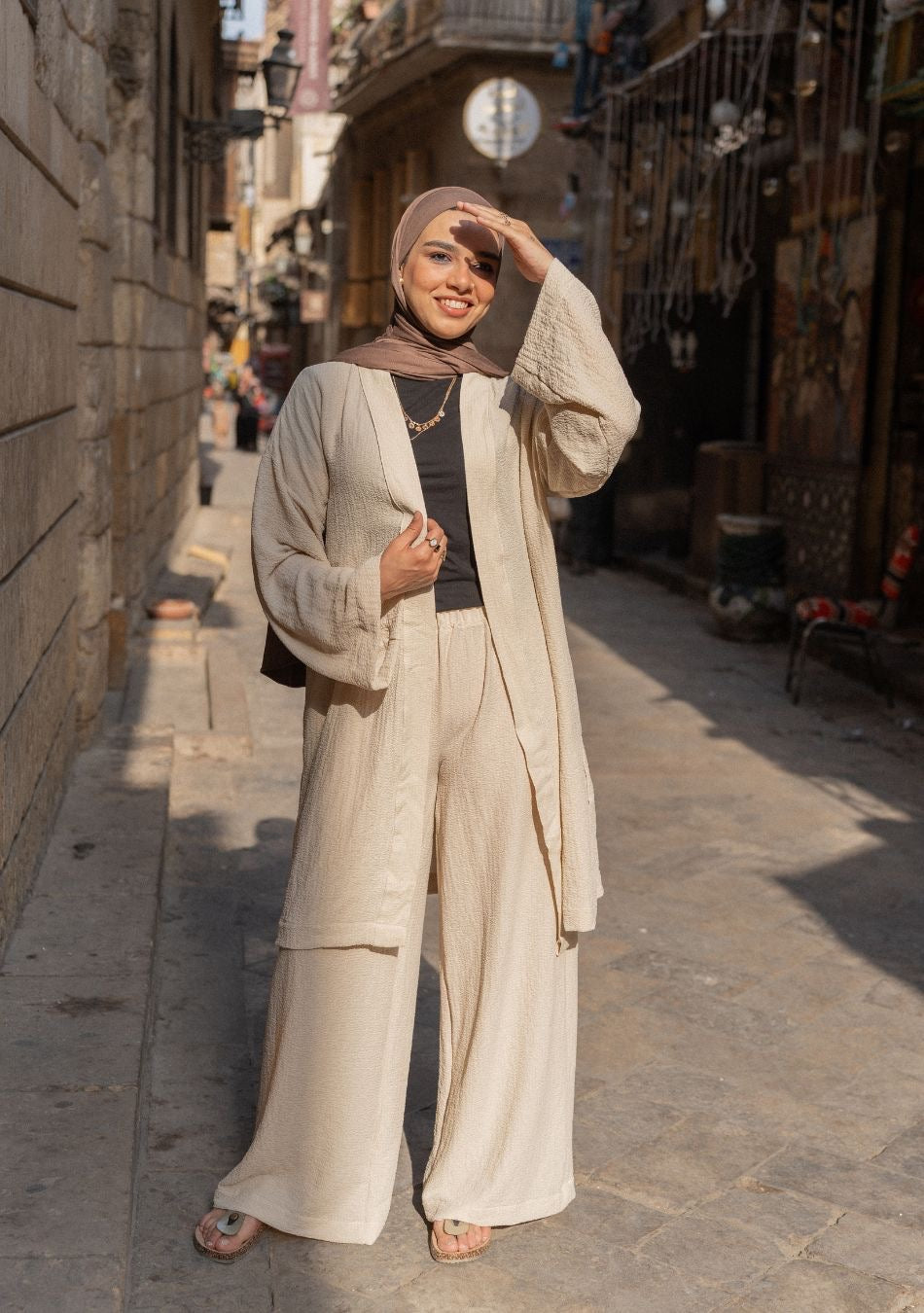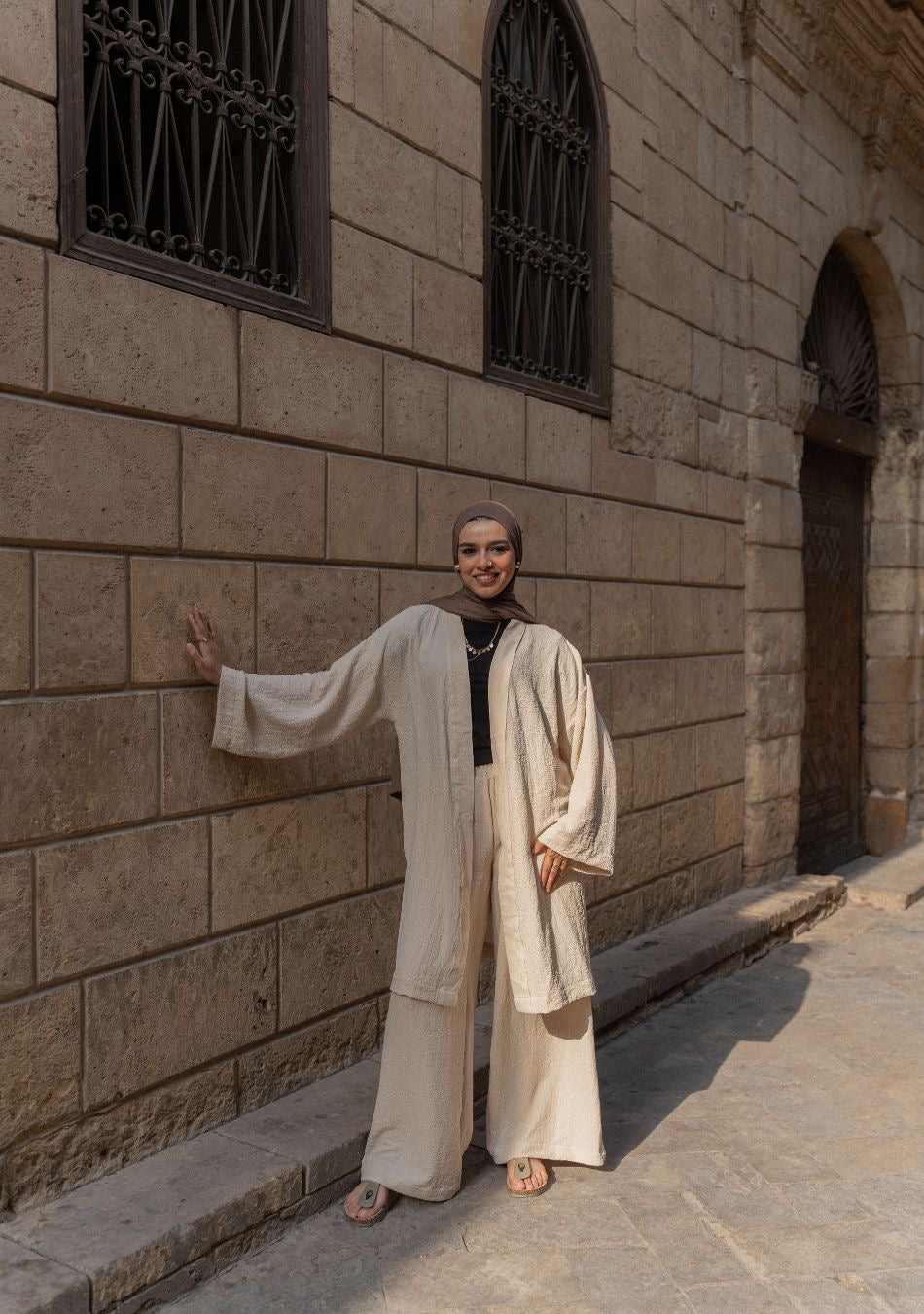 Inspired by the quiet elegance of desert landscapes, the Wadi Whisper Set pairs a flowy textured cardigan with relaxed-fit pants for a look that’s effortlessly graceful. Lightweight, breathable, and modest — available in serene shades of White, Black, Café, Beige, and Brown. Sizes M to XL.