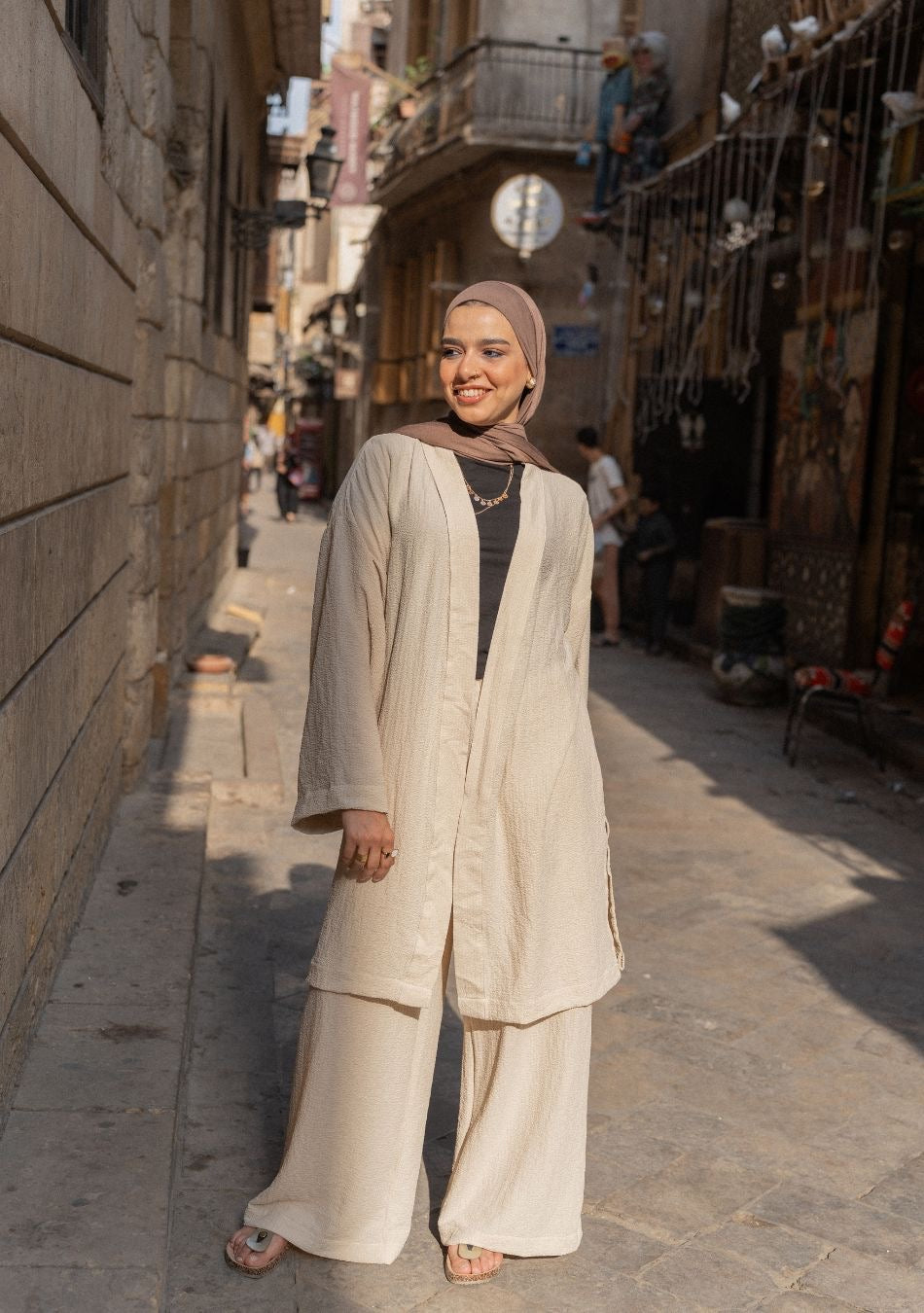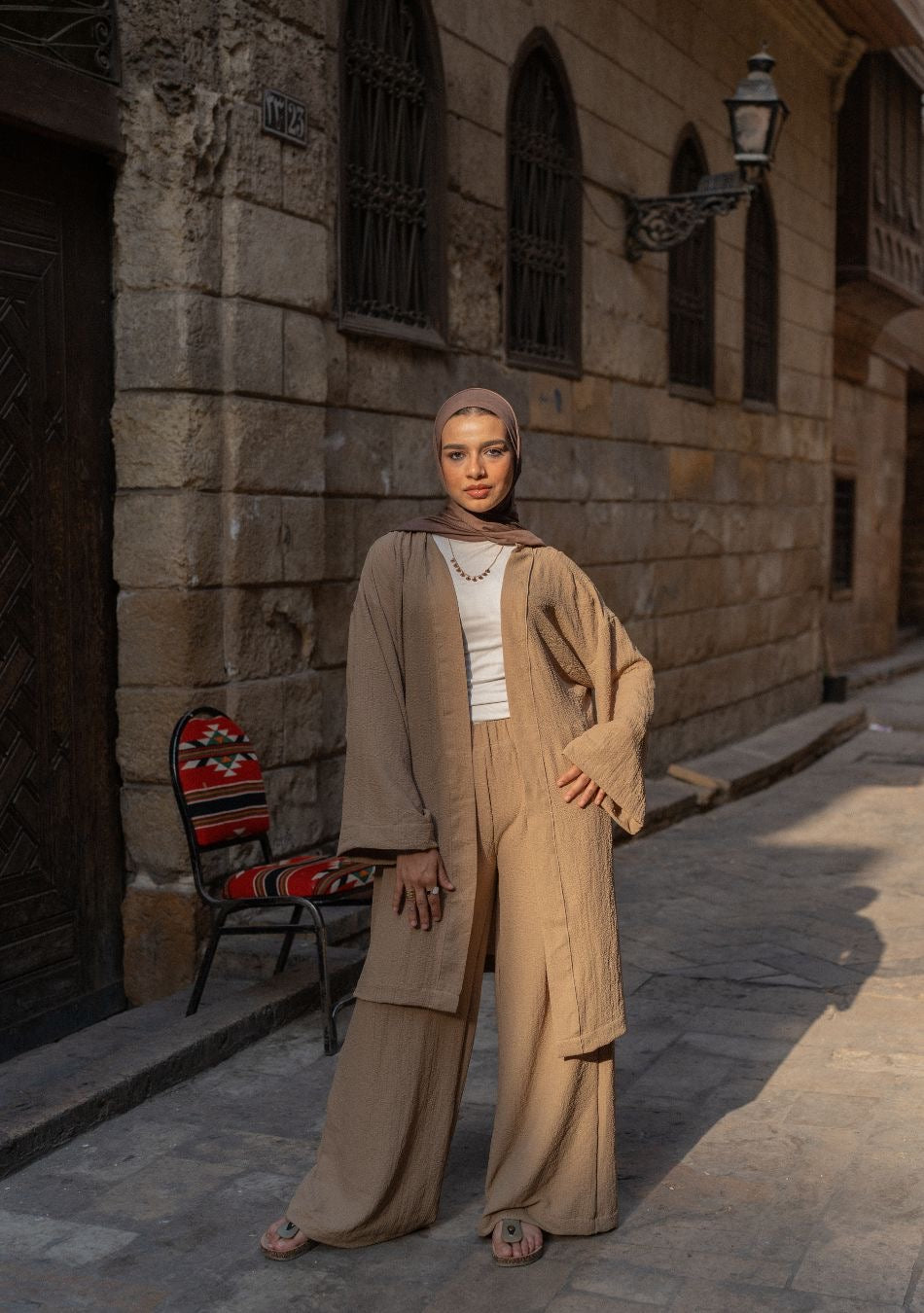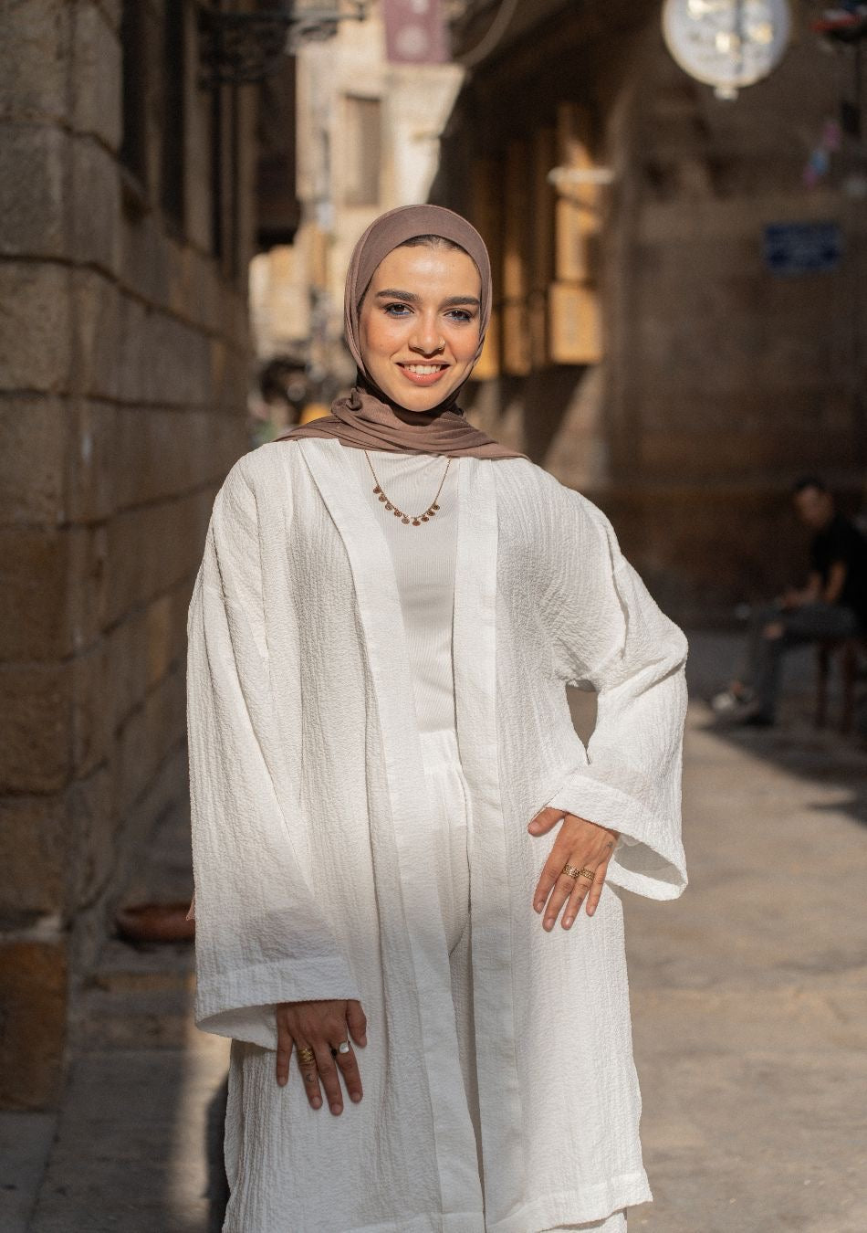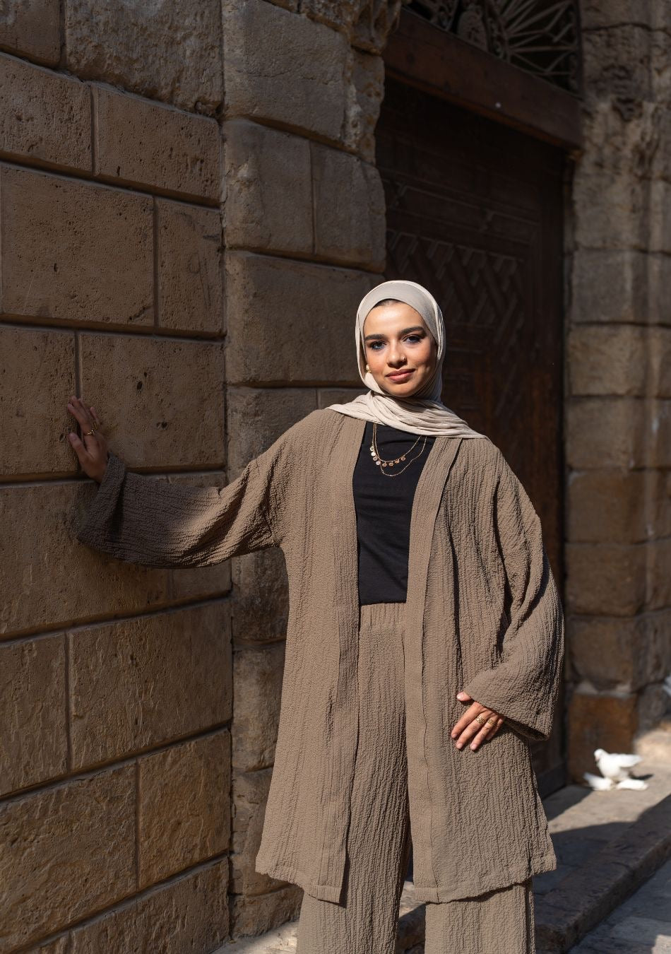 Inspired by the quiet elegance of desert landscapes, the Wadi Whisper Set pairs a flowy textured cardigan with relaxed-fit pants for a look that’s effortlessly graceful. Lightweight, breathable, and modest — available in serene shades of White, Black, Café, Beige, and Brown. Sizes M to XL.