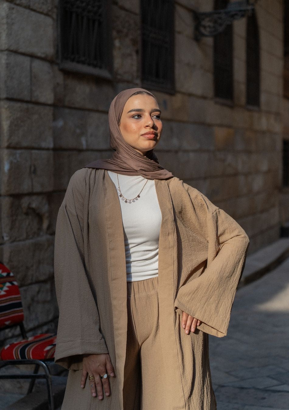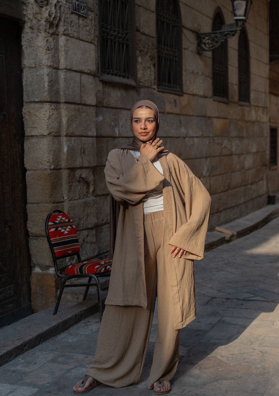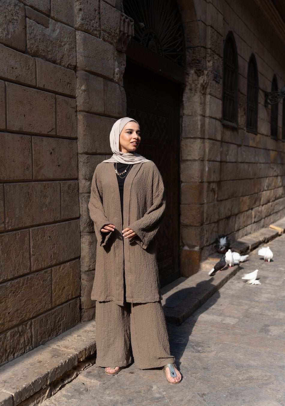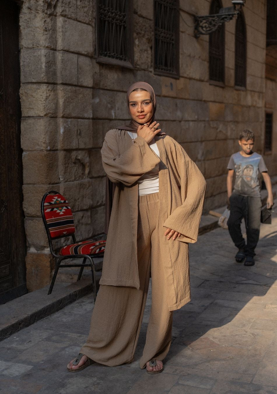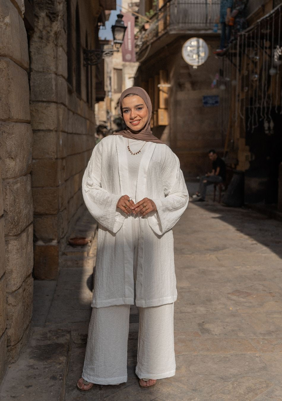 Inspired by the quiet elegance of desert landscapes, the Wadi Whisper Set pairs a flowy textured cardigan with relaxed-fit pants for a look that’s effortlessly graceful. Lightweight, breathable, and modest — available in serene shades of White, Black, Café, Beige, and Brown. Sizes M to XL.