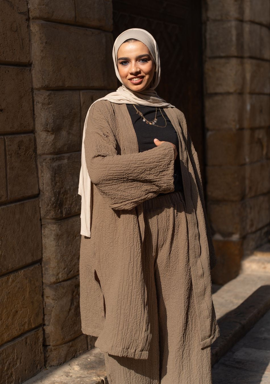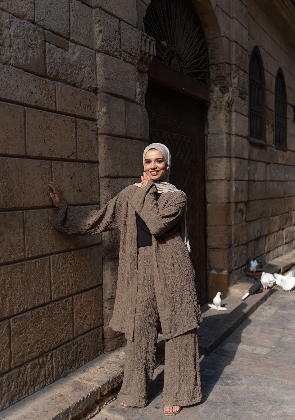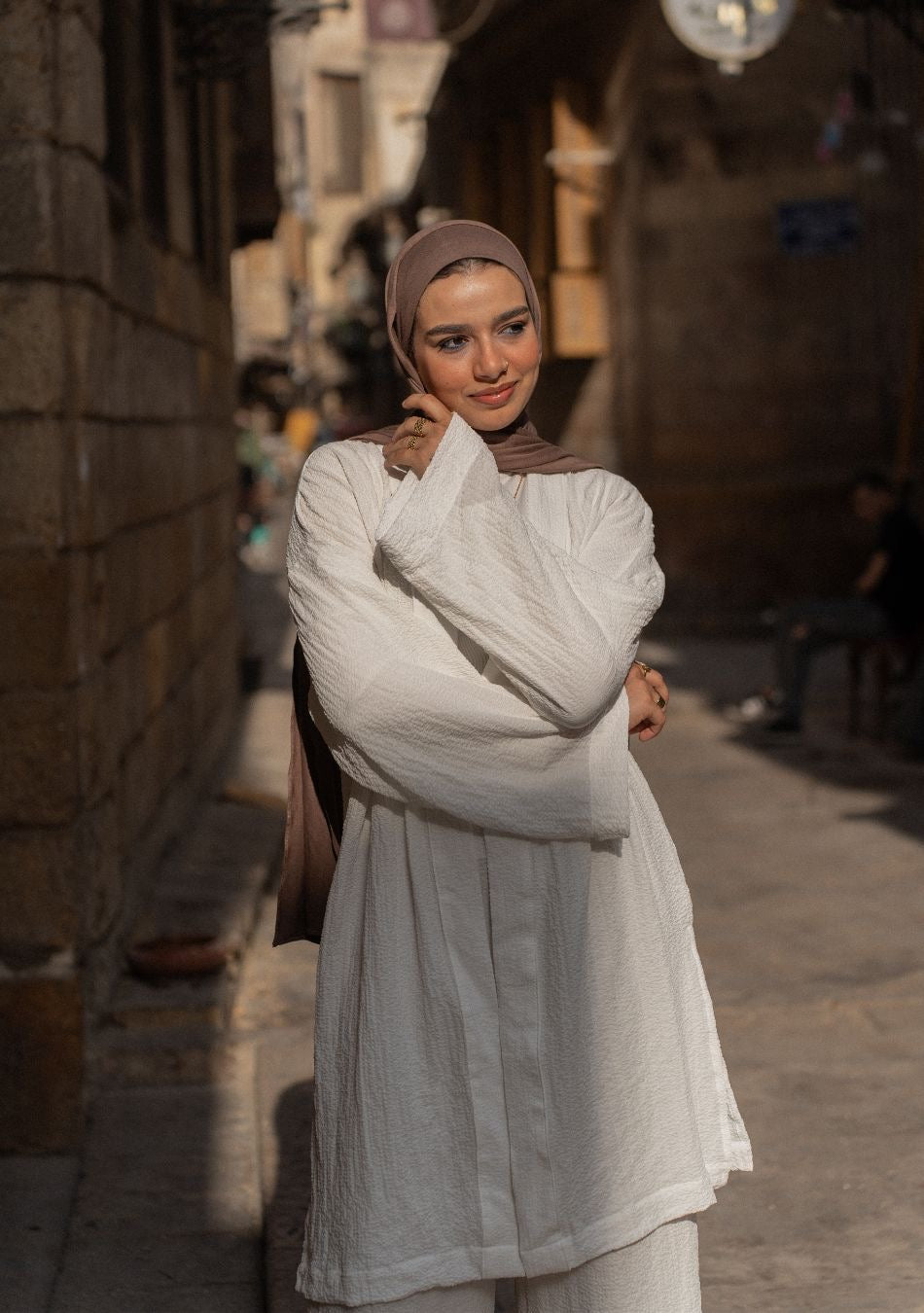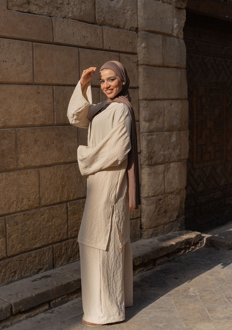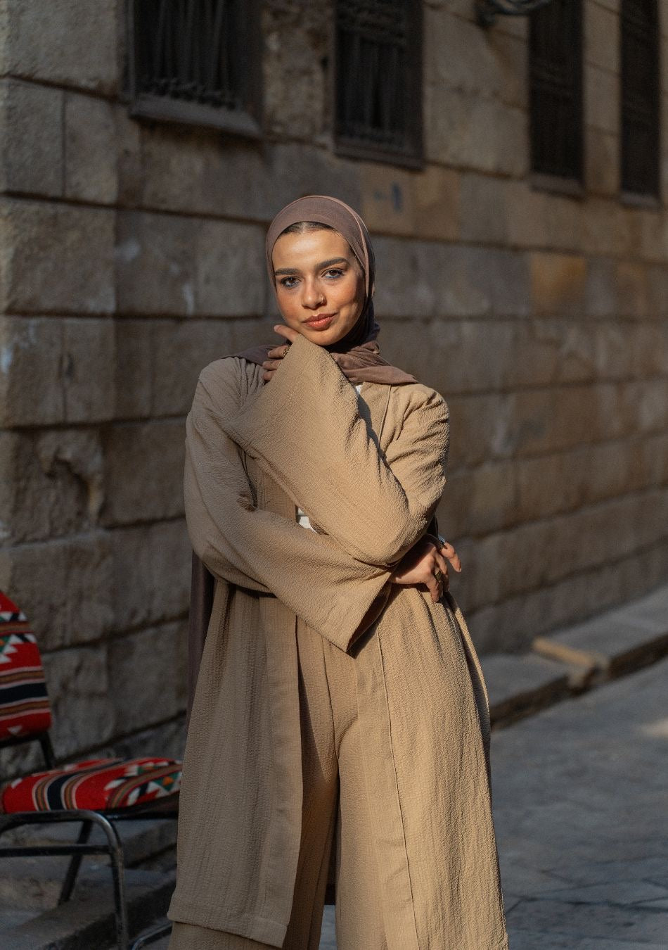 Inspired by the quiet elegance of desert landscapes, the Wadi Whisper Set pairs a flowy textured cardigan with relaxed-fit pants for a look that’s effortlessly graceful. Lightweight, breathable, and modest — available in serene shades of White, Black, Café, Beige, and Brown. Sizes M to XL.