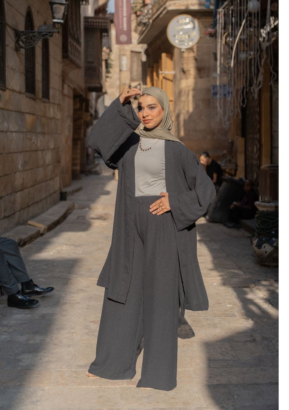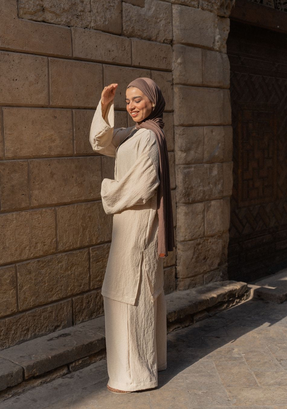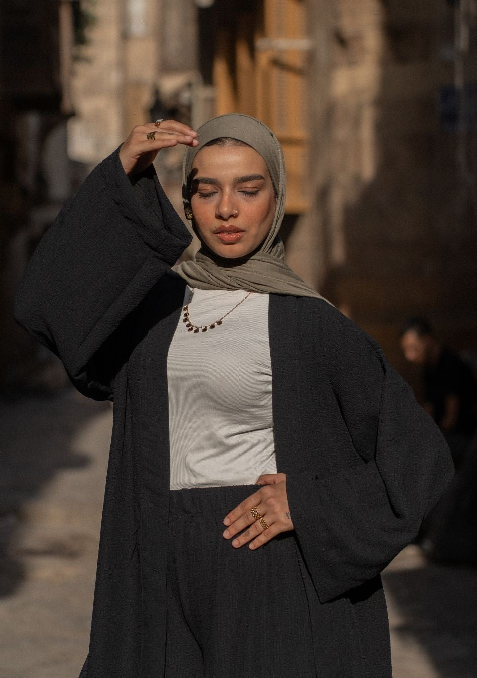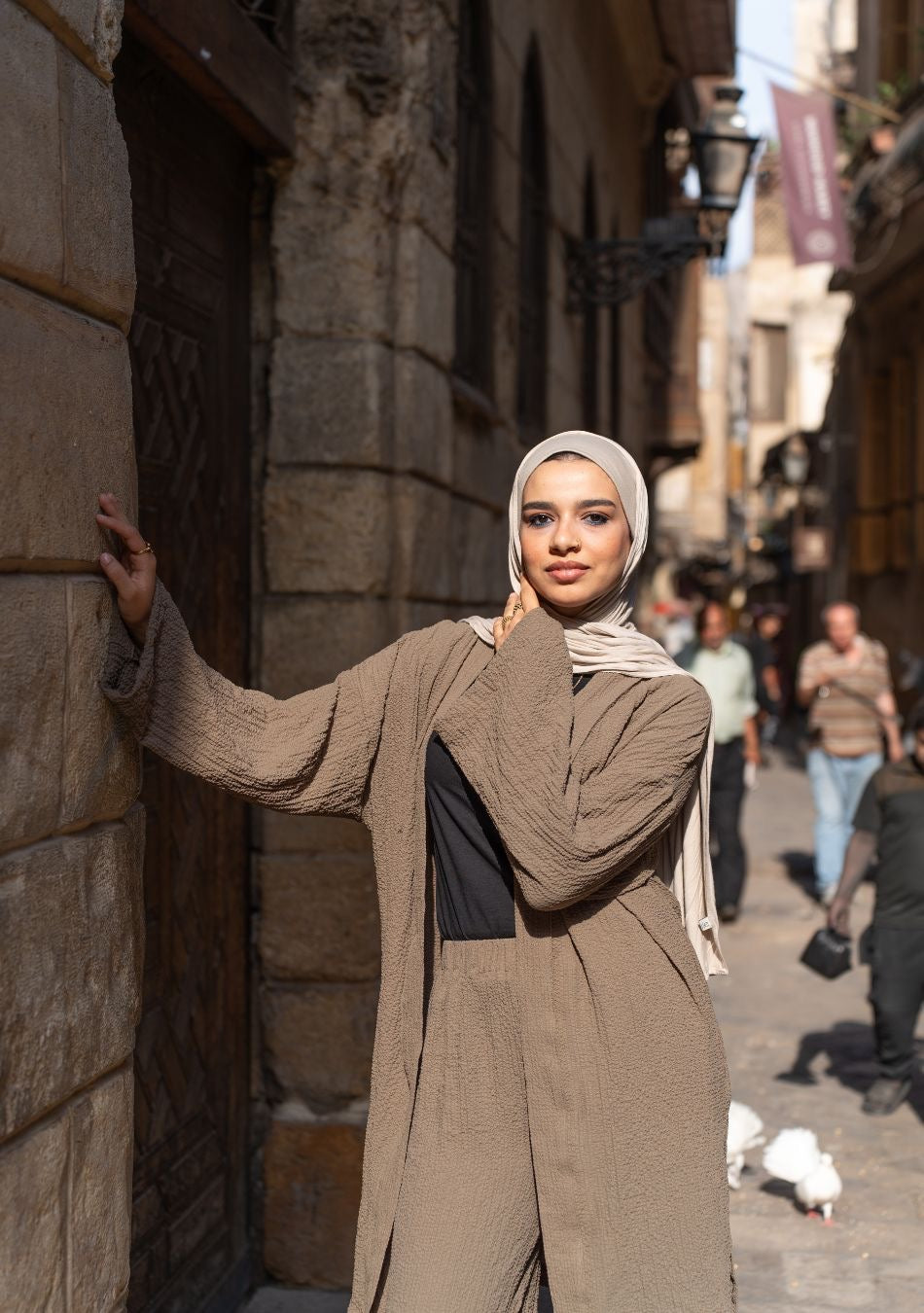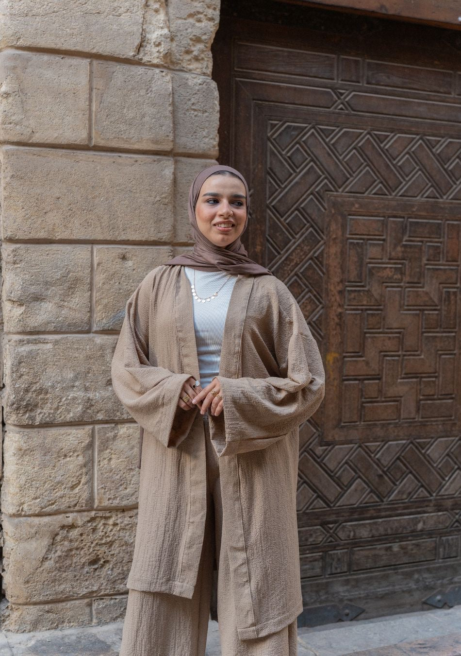 Inspired by the quiet elegance of desert landscapes, the Wadi Whisper Set pairs a flowy textured cardigan with relaxed-fit pants for a look that’s effortlessly graceful. Lightweight, breathable, and modest — available in serene shades of White, Black, Café, Beige, and Brown. Sizes M to XL.