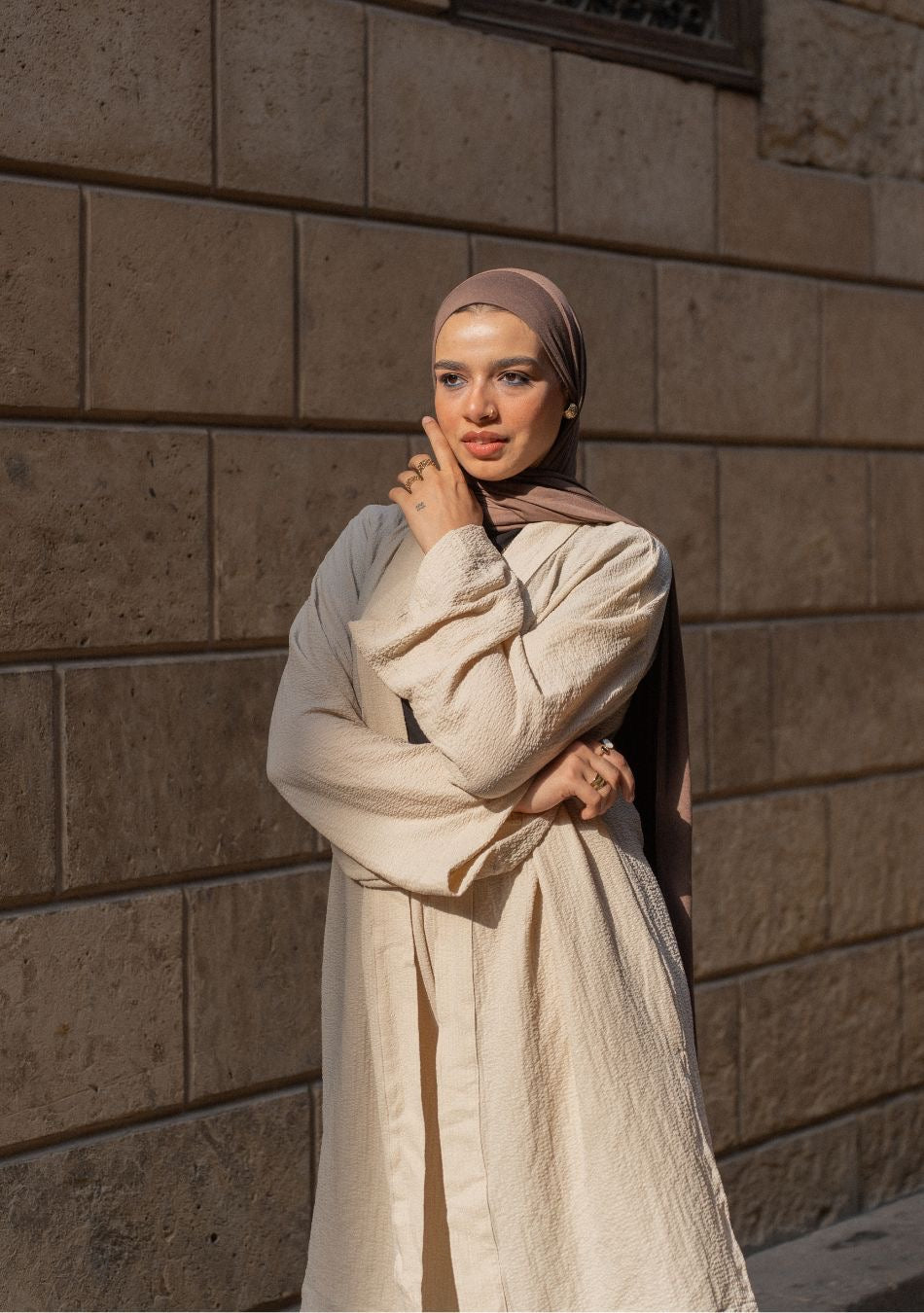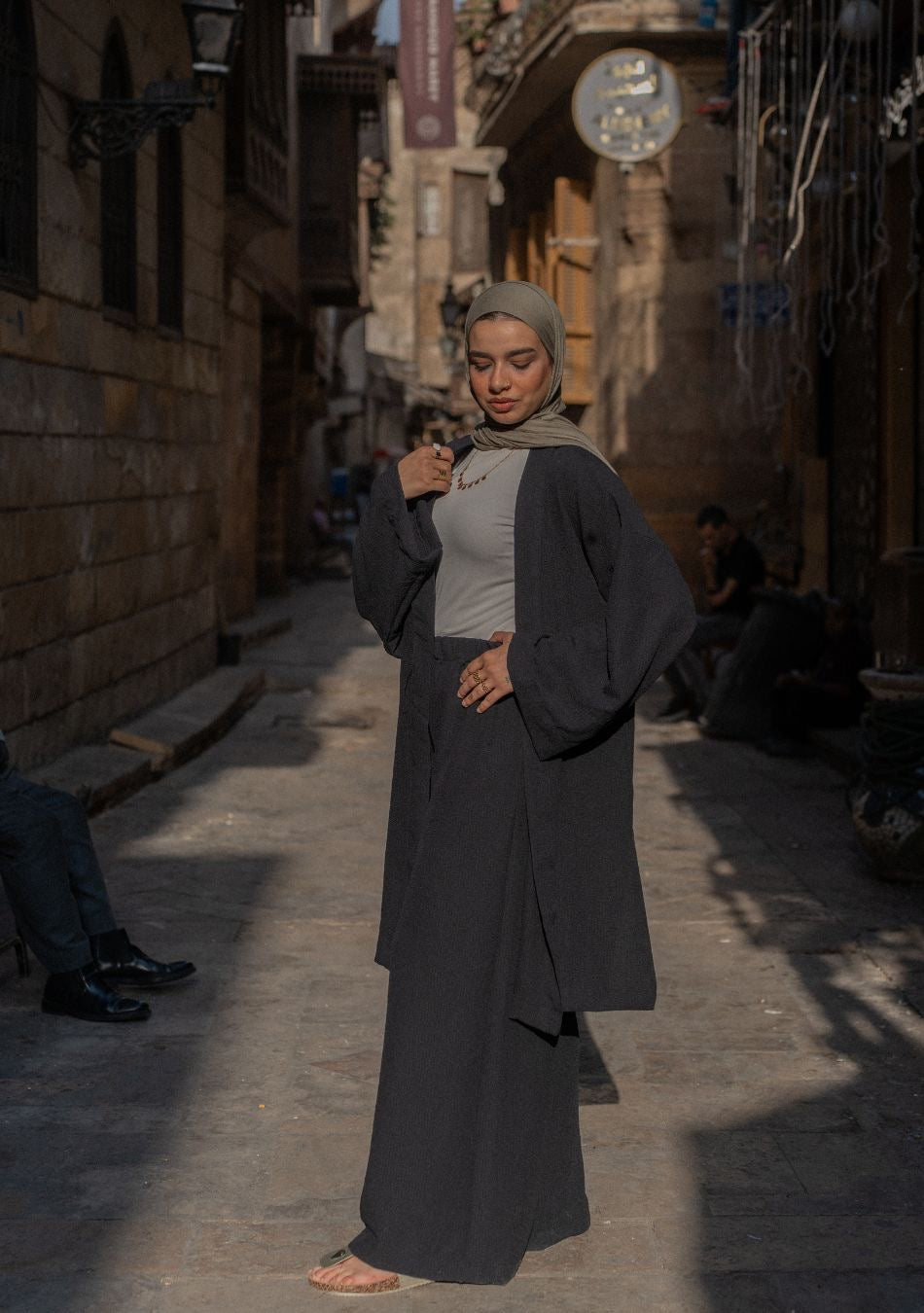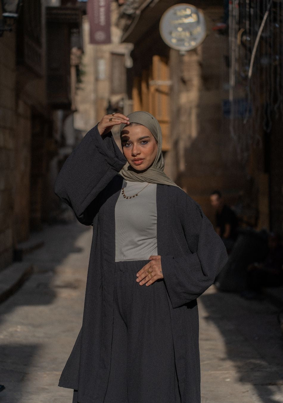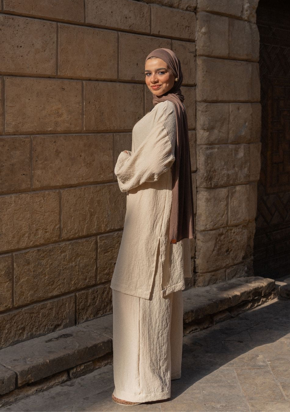Inspired by the quiet elegance of desert landscapes, the Wadi Whisper Set pairs a flowy textured cardigan with relaxed-fit pants for a look that’s effortlessly graceful. Lightweight, breathable, and modest — available in serene shades of White, Black, Café, Beige, and Brown. Sizes M to XL.